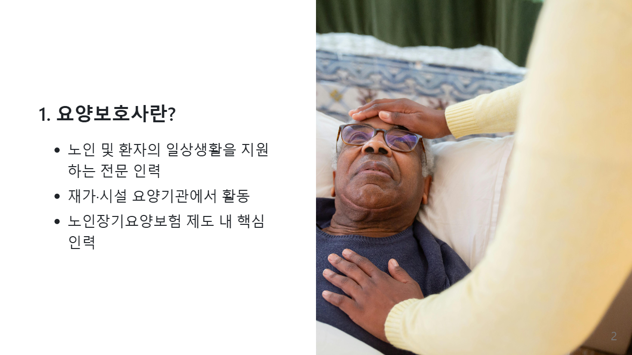 요양보호사는 나이가 들거나 질병으로 인해 혼자 일상생활이 어려운 어르신들을 도와주는 전문적인 직업이에요.