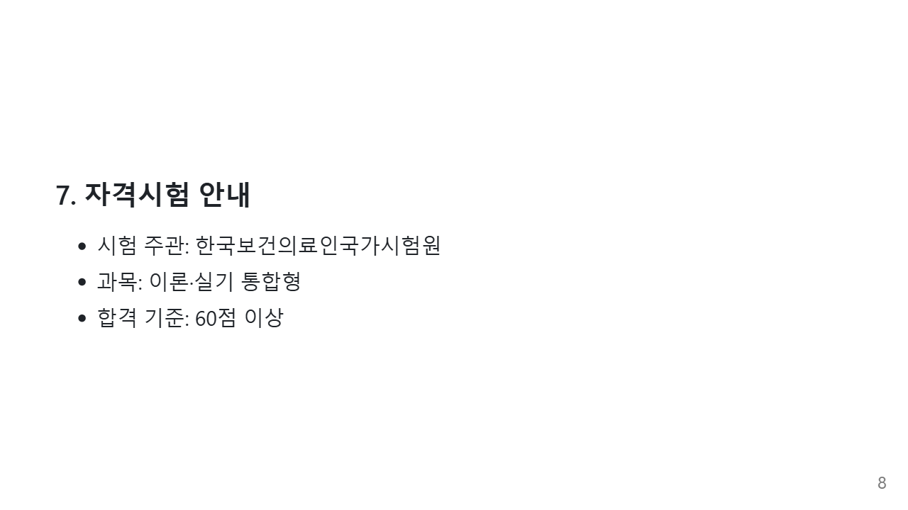 교육을 마친 후, 국가시험을 봐서 자격증을 얻게 됩니다. 시험은 필기시험과 실기시험 두 가지로 나누어져 있어요.