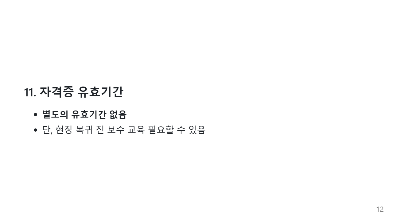- 국가 자격증 소지자는 교육시간이 대폭 줄어들어, 주간반은 5일, 야간반은 10일 정도로 단축됩니다.